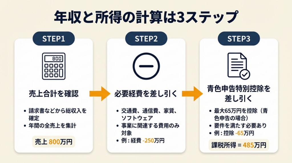 年収と所得の違い:フリーランスの場合は3ステップで計算