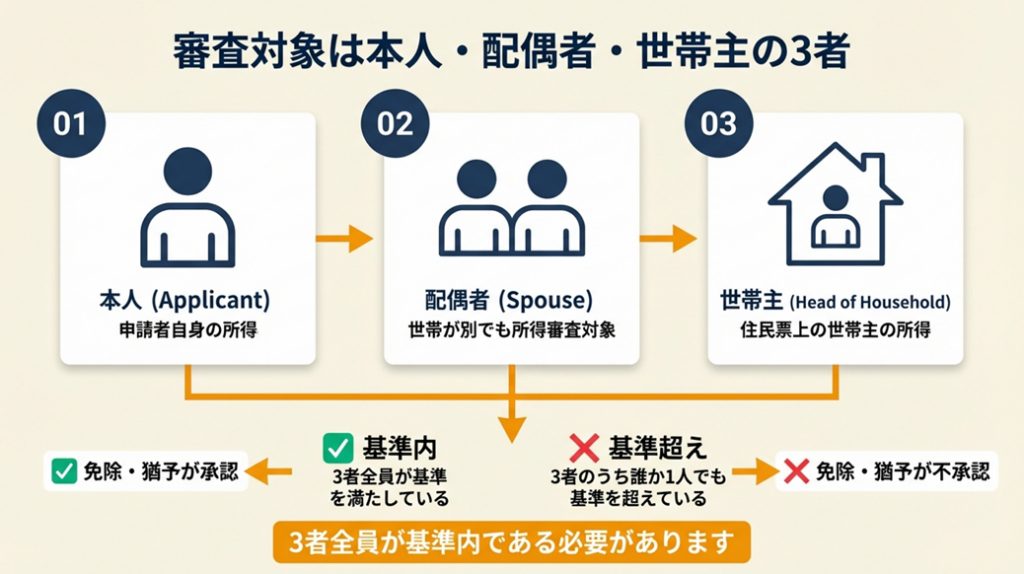 国民年金の免除審査は、申請者本人だけでなく、配偶者(別世帯の配偶者を含む)と世帯主の所得も含めた3者すべてが審査対象となります(日本年金機構「国民年金保険料の免除制度・納付猶予制度」)。3者のうち1人でも所得基準を超えていると、免除は認められません。