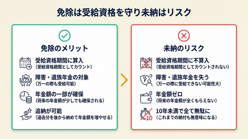 なぜ効くのか: 未納状態では「保険料納付済期間+免除期間+猶予期間+学生特例期間」を合算した受給資格期間が10年に達しない場合、老齢基礎年金を受け取れない。また障害基礎年金・遺族基礎年金は「直近1年間に未納がない」などの納付要件があり、未納のタイミングが悪いと万が一の時に受給できない。免除はこのリスクを完全に回避する仕組みである。
