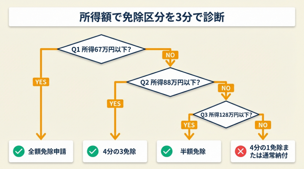 - 所得67万円以下で全額免除、4段階の基準を5分で確認できる