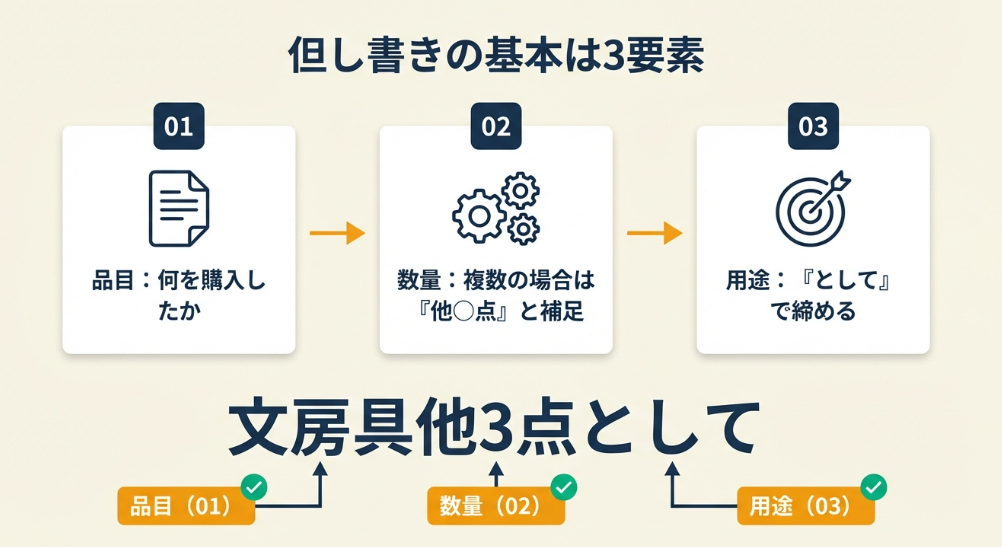 複数の商品を購入した場合は「文房具他3点として」「書籍他2点として」のように、代表的な商品名と点数を記載してください。詳細はレシートで補完できます。