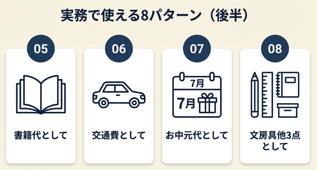 - 各品目に対応する但し書きフレーズを決める(例:「手土産代として」「文房具代として」)(5分)