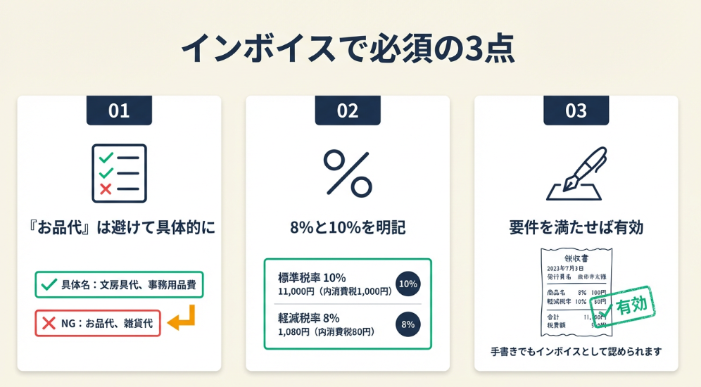 「お品代」のような抽象的な表現では、取引内容が不明確とみなされます。
