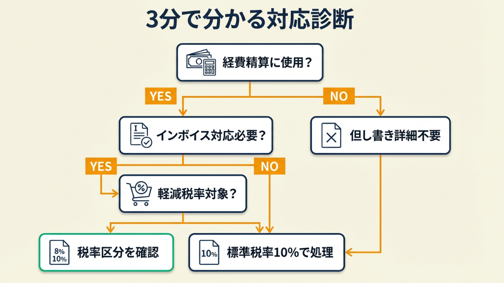 | 自分の状況を診断したい | 領収書但し書きの対応を3分で診断 | 3分 |