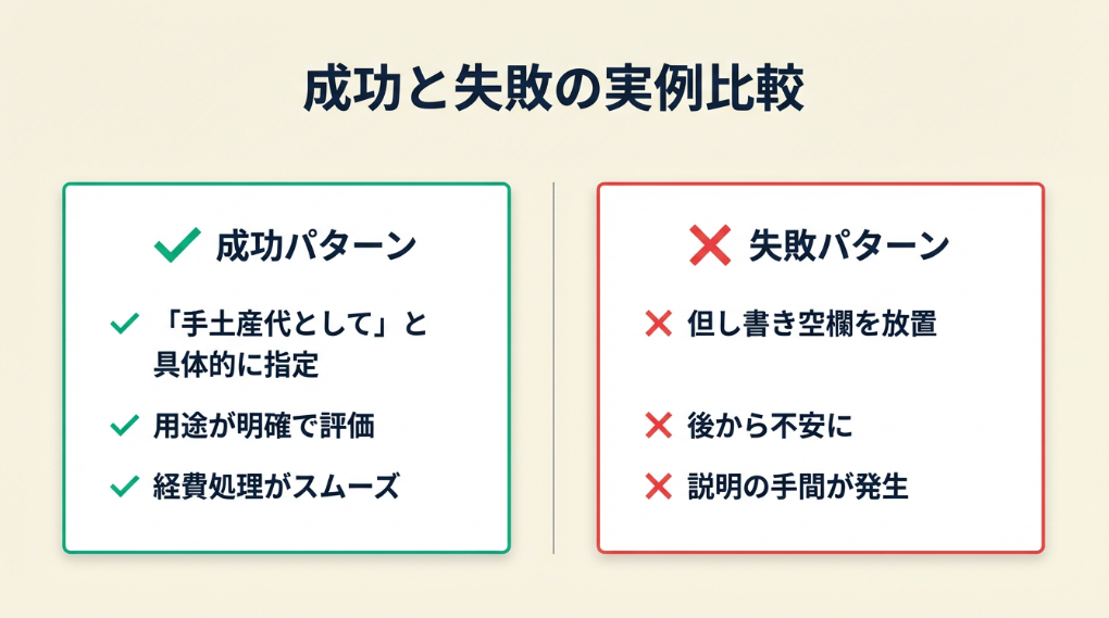 贈答品の場合は「お中元代として」「お歳暮代として」と季節を明記すると、経費の用途が明確になります。