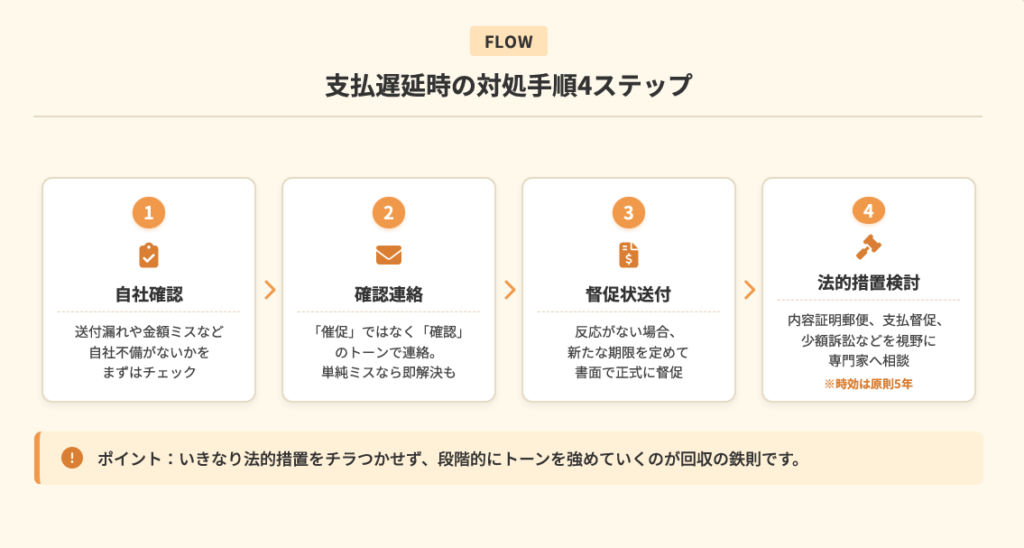 - 3回目:取引終了を検討。未払い分は督促・法的措置で回収