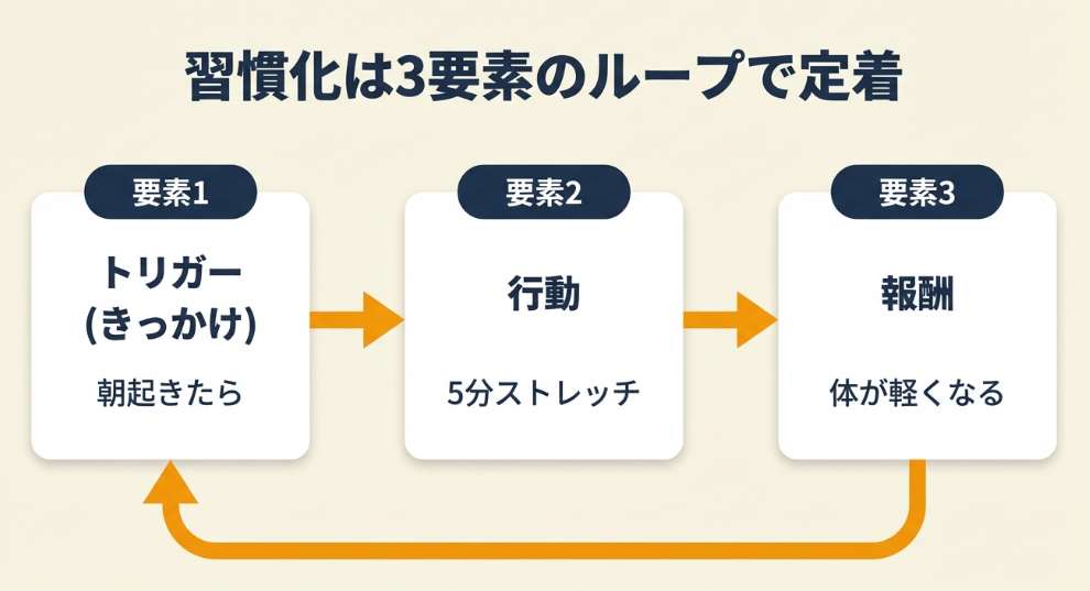 たとえば「朝起きたら(トリガー)→ 5分だけストレッチする(行動)→ 体が軽くなる(報酬)」というサイクルを繰り返すことで、行動が自動化されていきます。