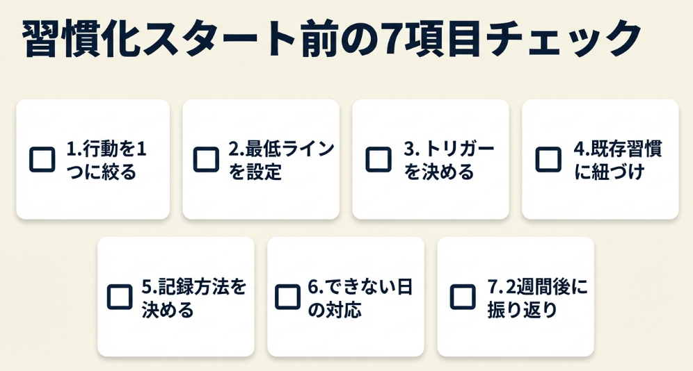 | 始める前にチェックしたい | 習慣化は7項目でチェック | 2分 |
