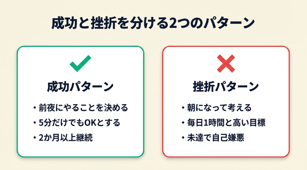 ここでは、実際の体験談をもとに成功パターンと挫折パターンを紹介します。自分の状況と照らし合わせて、どちらに近いかを確認してください。