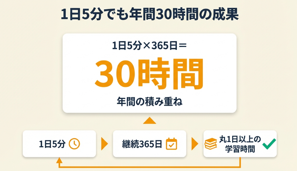 これは丸1日以上の学習時間に相当し、ゼロの日が続くよりも圧倒的に成果が出ます。小さく始めることの威力は、積み重ねで初めて実感できるものです。