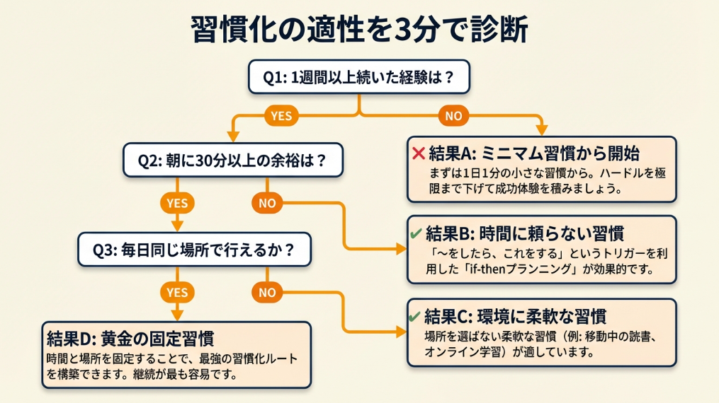 | 自分に合う方法を診断したい | 習慣化の適性を3分で診断 | 3分 |
