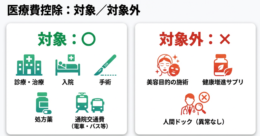 医療費控除の対象となるのは、治療目的の診療費・手術費・入院費・薬代・通院交通費(公共交通機関)などです。美容目的の手術や健康増進だけのサプリメント費用、人間ドック(異常が発見されなかった場合)は対象外となります(freee)。
