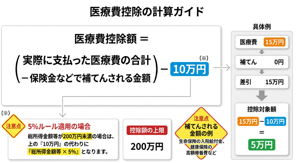 医療費控除の対象となる金額は「実際に支払った医療費の合計額−保険金などで補てんされる金額−10万円(または総所得金額等の5%のいずれか少ない方)」で計算します(国税庁タックスアンサー)。控除額の上限は200万円です。