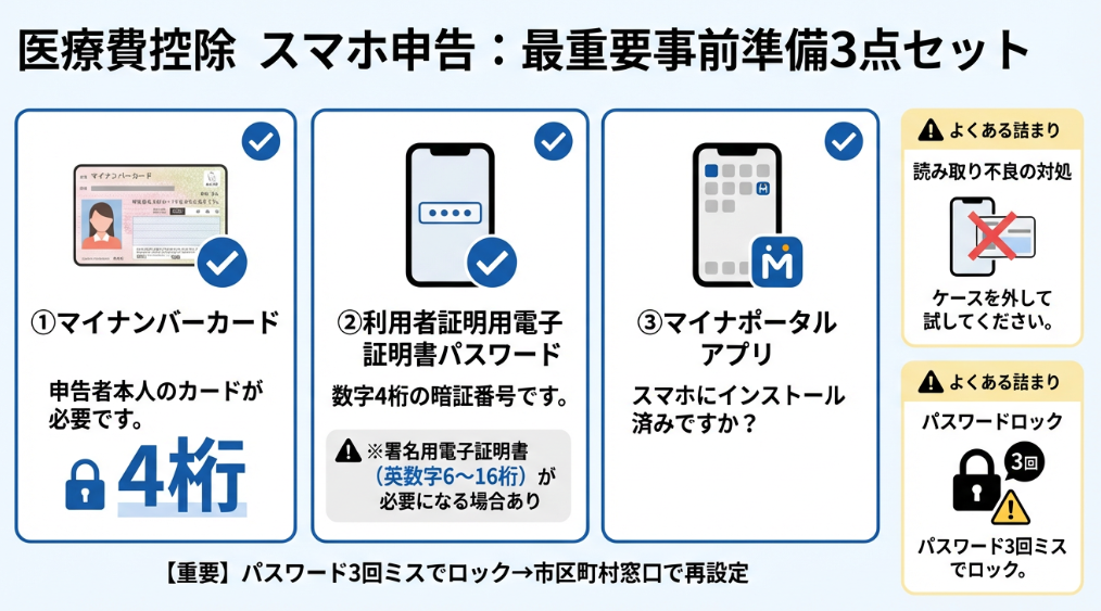 スマホで医療費控除の確定申告を行うには、以下の3点が必要です(freee)。