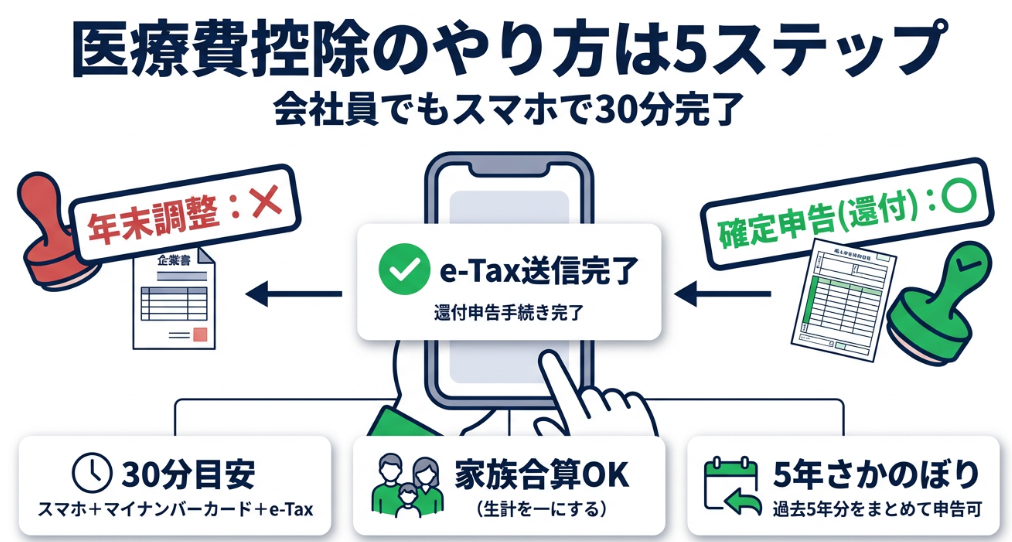 医療費控除は年末調整では受けられないため、会社員でも自分で確定申告が必要です。スマホとマイナンバーカードがあれば、国税庁の確定申告書等作成コーナーから30分程度で申告が完了します。