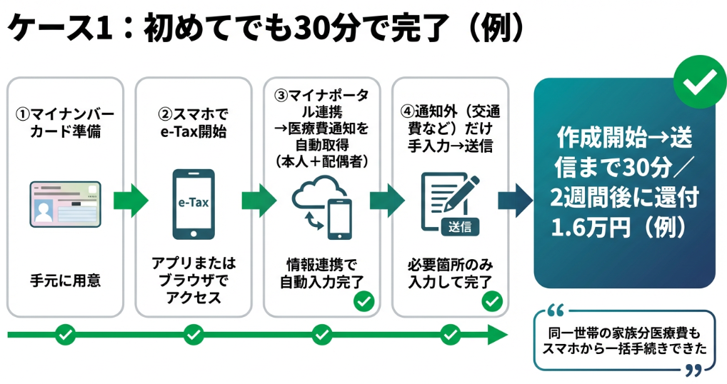 スマホとマイナンバーカードを使ったe-Tax申告であれば、30分〜1時間程度で完了します。マイナポータル連携で医療費通知を自動取得すれば、さらに時短が可能です。