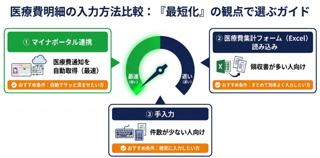 医療費控除の入力画面で、医療費の明細を入力します。入力方法は以下の3つから選べます。