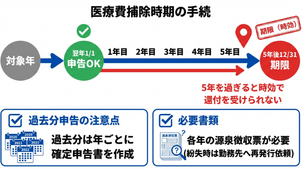 医療費控除は年間10万円超の医療費を支払った会社員が、確定申告で所得控除を受けられる制度です。年末調整では申告できず、翌年1月1日から5年間いつでも還付申告が可能です(国税庁タックスアンサー)。
