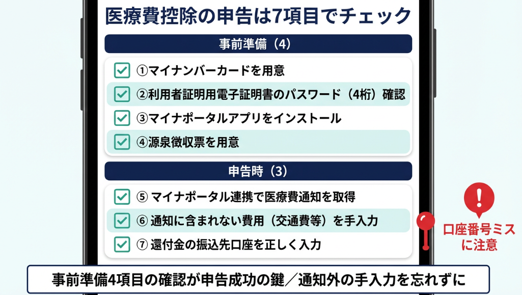 医療費控除は「やり方さえわかれば難しくない」制度です。この記事で紹介した5ステップとチェックリストを活用し、スマホで申告を完了させてください。まずはマイナンバーカードとパスワードの確認から始めましょう。